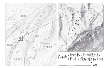 1.2 样品采集与测定选取缙云山常绿阔叶林(简称,阔叶林)、针叶林、针-阔混交林(简称,混交林)、竹林和荒草地5种植被类型,每种植被类型布置3个采样区,在每个采样区随机设置3个采样点,利用剖面取样法在各个样点的0 ~ 20、20 ~ 40、40 ~ 60及60 ~ 100 cm土层深度分别进行取样,按照层次将各采样区的3个采样点土样进行混合,用4分法取足够土样,土壤采样方法与吕盛[19]采用的一致。去除土样中的杂质,风干研磨后过0.25 mm筛,测定土壤MBC、DOC和ROC。采样点信息见表 1,研究区所在位置及采样点的空间位置见图 1。