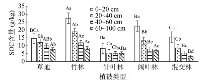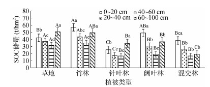 (不同大写字母表示同一土层深度不同植被类型间差异显著(P < 0.05),不同小写字母表示同一植被类型不同土层深度间差异显著(P < 0.05),下同) 图 2 不同植被类型下SOC的分布特征 Fig. 2 Profile distribution of SOC contents under different vegetation types |
