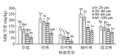 图 3 不同植被类型下土壤MBC分布特征 Fig. 3 Profile distribution of MBC contents under different vegetation types |