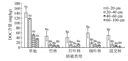 由图 4可知,在0 ~ 20 cm土层,各植被类型下的DOC含量均显著高于其他各土层(P < 0.05),表现出明显的表聚效应。相较0 ~ 20 cm土层,5种植被类型在其他土层的DOC含量随土层深度增加的降幅变化范围分别为:16.08% ~ 74.78%、72.80% ~ 83.06%、65.76% ~ 87.17%、65.18% ~ 83.21%、73.72% ~ 90.30%;在各植被类型间,DOC含量并没有表现出显著的差异性(P < 0.05)。DOC在0 ~ 20 cm土层含量大小依次为:草地(141.98 mg/kg) > 阔叶林(59.36 mg/kg) > 混交林(49.70 mg/kg) > 竹林(46.63 mg/kg) > 针叶林(40.59 mg/kg)。DOC含量的剖面分布中,草地各土层显著高于其他植被(P < 0.05)。