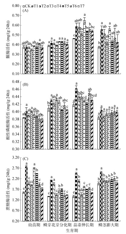 由图 1C可知,不同处理的土壤蔗糖酶活性总体上以T1处理最高。在幼苗期,以T1、T4处理的蔗糖酶活性最高,与CK相比,T1 ~ T7提高了12.48%(T7)~ 78.76%(T1);在鳞芽花芽分化期,以T1、T2处理最高,与CK相比,T1、T2、T4、T5处理提高了20.47%(T4)~ 55.58%(T1);在蒜薹伸长期,以T1处理最高,与CK相比,除T3处理外,其他处理提高了11.93%(T7)~ 79.57%(T1);在鳞茎膨大期,仅T1处理显著高于CK。