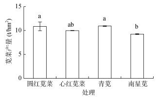 2 结果与分析 2.1 填闲苋菜产量与氮磷吸收量不同填闲苋菜产量(鲜重)如图 1所示。结果表明,青苋与圆红苋菜产量最高,分别可达10.95 t/hm2与10.87 t /hm2,其次为心红苋菜,产量达9.99 t/hm2,而南星苋产量最低,仅为9.26 t/hm2(显著低于青苋与圆红苋菜14.8% ~ 15.4%)。因此,产量由高到低依次为青苋 > 圆红苋菜 > 心红苋菜 > 南星苋。可见,夏季休闲期间种植苋菜,可获得较高产量,但不同品种苋菜的产量存在一定差异。