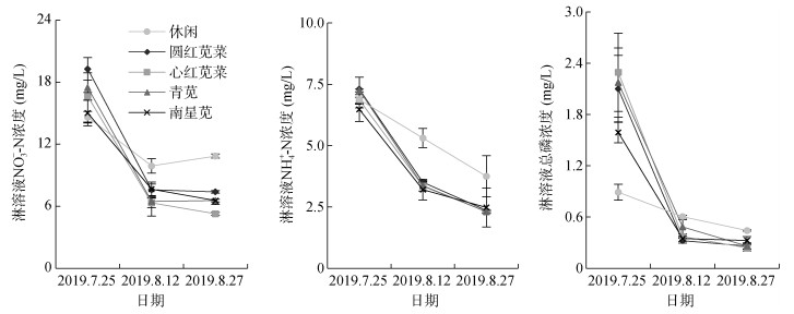 各处理淋溶液NO3–-N、NH4+-N与总磷的浓度变化见图 3。各处理淋溶液不同形态氮磷浓度峰值均出现在第一次采样期7月25日,即填闲种植最初期,其后随着种植时间变化,不同形态氮磷浓度随之下降,至填闲苋菜收获时降至最低,其中以心红苋菜处理的NO3–-N、NH4+-N、总磷浓度降幅最大,分别降至5.28、0.31、0.24 mg/L(图 3)。