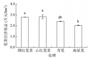 2.3 填闲苋菜的经济效益与氮磷淋失阻控效果 2.3.1 填闲苋菜的经济收益如前所述,在休闲期种植苋菜,均可获得一定的生物产量。根据市场价格(心红苋菜、圆红苋菜、青苋与南星苋的价格分别为2.8、2.6、2.2与2.2元/kg)估算,对应4种填闲苋菜的经济效益分别为2.83、2.80、2.41、2.04万元/hm2(图 4)。就经济效益而言,心红苋菜与圆红苋菜单位面积纯收入最高,两者优势突出,因为心红苋菜市场单价更高,而圆红苋菜具有较高产量(图 1)。