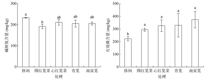 图 5 填闲苋菜收获后土壤碱解氮与有效磷含量 Fig. 5 Contents of soil alkali-hydrolyzed nitrogen and available phosphorus after harvest of amaranth |