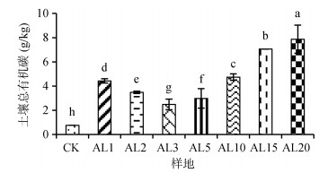2.3 不同撂荒年限对土壤有机碳含量和分布的影响 2.3.1 对土壤总有机碳含量的影响如图 1所示,撂荒恢复后土壤总有机碳含量较CK均显著增加,增加范围为1.72 ~ 7.12 g/kg。不同撂荒年限中,土壤总有机碳含量随撂荒年限的延长呈现出先减少后增加的趋势,其中在AL3样地达最小值2.48 g/kg,在AL20样地达最大值7.88 g/kg。不同样地间差异性均达显著水平(P < 0.05)。