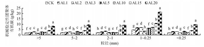 由图 2可知,不同撂荒年限土壤 > 5、5 ~ 2、2 ~ 1、1 ~ 0.25、< 0.25 mm机械稳定性团聚体有机碳含量变化范围分别为1.55 ~ 8.13、1.75 ~ 9.26、2.12 ~ 9.19、3.57 ~ 21.38、2.05 ~ 9.79 g/kg,土壤机械稳定性团聚体有机碳含量随着撂荒年限的增加呈现出先减少后增加的趋势。其中,AL3样地在大团聚体各粒径中有机碳含量均为最小值,撂荒3 a后,土壤机械稳定性团聚体有机碳含量逐年递增,各粒径团聚体有机碳含量在AL20样地中均达最大值,变化范围为8.13 ~ 21.38 g/kg。随团聚体粒径的逐渐减小,各撂荒年限土壤机械稳定性团聚体有机碳含量均呈现出先增后减的趋势,以1 ~ 0.25 mm团聚体有机碳含量最高,平均达8.43 g/kg,而 > 5 mm团聚体有机碳含量最低,平均为3.33 g/kg。除 > 5 mm团聚体有机碳含量在AL2与AL5样地间差异不显著外,其余粒径团聚体在CK及各撂荒年限样地间差异性均达显著水平(P < 0.05)。