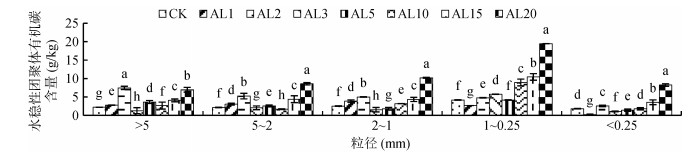 由图 3可知,土壤水稳性团聚体有机碳含量随撂荒年限的延长均呈现出先增后减再逐步增加的趋势,其中AL2样地水稳性团聚体有机碳含量较CK和AL1样地显著增加,而AL3与CK相比显著降低,除AL2样地 > 5 mm水稳性团聚体有机碳含量高于AL20样地外,其余粒径团聚体中有机碳含量均以AL20样地最高。各粒径水稳性团聚体有机碳含量变化范围分别为1.27 ~ 6.93、1.66 ~ 8.56、1.53 ~ 10.19、2.67 ~ 19.46、0.23 ~ 8.24 g/kg。各样地水稳性团聚体有机碳含量随粒径的减小呈现出先增加后减少的趋势,以1 ~ 0.25 mm水稳性团聚体有机碳含量最高,其中AL20样地达最大值19.46 g/kg。除了1 ~ 0.25 mm与 < 0.25 mm水稳性团聚体有机碳含量在CK与AL10样地间差异不显著,其余粒径团聚体在CK及各撂荒年限样地间差异性均达显著水平(P < 0.05)。