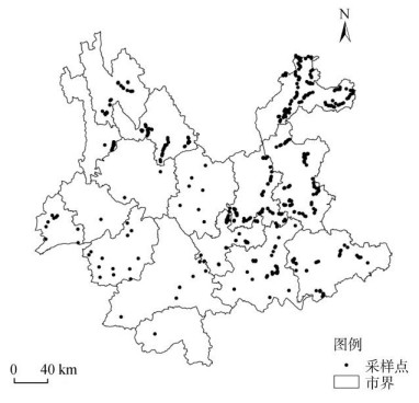 1 材料与方法 1.1 研究区域概况云南省位于中国西南边陲,位于97°31′~ 106°12′E,21°08′~ 29°15′N。东西宽865 km,南北长990 km,国土面积38.32万km2。云南地势呈现西北高东南低的特征,海拔高差较为悬殊,相对平缓的山区只占总面积的10%,大面积土地高低差参,纵横起伏。由于其地势的特殊性,气候类型复杂多样,兼具低纬气候、季风气候、山原气候的特点,年温差小,日温差大,干湿季节分明,大部分地区年降雨量在1 000 mm以上,但地域分配极不均匀。土壤类型主要以红壤、赤红壤、砖红壤、紫色土、黄壤、水稻土等为主,土壤成土母质类型多样,主要为酸性结晶岩类的花岗岩等、基性结晶岩类的玄武岩等、紫色岩类和碳酸盐岩类等。