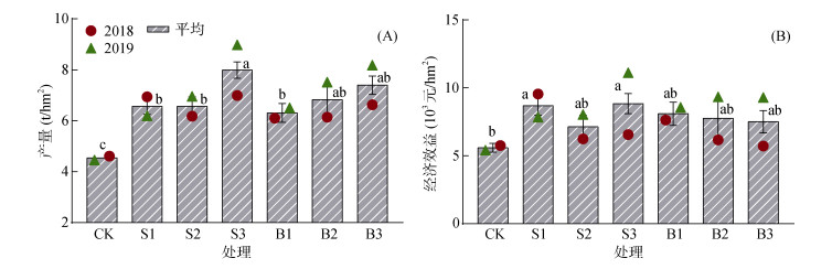 2 结果与分析 2.1 菌渣施用对小麦产量及经济效益的影响施用菌渣处理的小麦产量均显著高于CK(P < 0.05;图 1A),两个生长季平均增产幅度为39.0% ~ 63.3%。随着菌渣施用量的增加,小麦产量呈增加趋势,但同一施用水平下两种菌渣类型间的小麦产量无显著差异(P > 0.05)。相比CK,施用菌渣后经济效益平均增加1 552 ~ 3 257元/hm2(27.8% ~ 58.4%;图 1B)。各菌渣施用处理中,S3处理的平均产量(7.99 t/hm2)和经济效益(8 838元/hm2)均表现为最高,且与CK间差异均达显著水平(P < 0.05)。