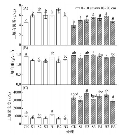 (图中误差线代表标准误(n = 3);不同小写字母表示各土层下 不同处理间存在显著差异(P < 0.05)) 图 2 不同处理0 ~ 10及10 ~ 20 cm土壤有机质(A)、容重(B)及紧实度(C)变化 Fig. 2 Soil organic matter contents (A), bulk densities (B), and compactness (C) of 0-10 cm and 10-20 cm depths under different treatments |