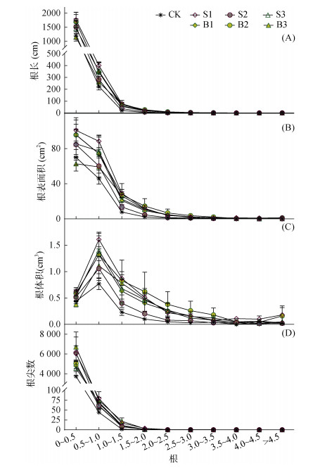 B3处理下的小麦根系干物质量最高(0.70 g/株),且显著(P < 0.05)高于其他处理(表 3)。施用菌渣后根系比根长有增加趋势(B3处理除外),其中S3处理增加幅度最高(63.0%),且显著高于CK(P < 0.05)。各处理中,B3处理的根组织密度最高(3.80 mg/cm3);但其余菌渣施用处理的根组织密度均低于CK,且除B1处理外,与CK间差异均达到显著水平(P < 0.05)。