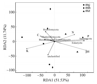 图 2 真菌优势类群与土壤环境因子的RDA分析 Fig. 2 Redundancy analysis of fungal dominant groups and soil environmental factors |