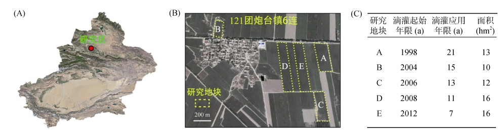 1 材料与方法 1.1 研究区概况研究区地处天山北麓、古尔班通古特大沙漠南缘(图 1),位于玛纳斯河流域下野地灌区内的121团,121团隶属于新疆生产建设兵团第八师。其地理位置为85°01' ~ 86°32'E,43°27' ~ 45°21'N,平均海拔337 m,属于温带大陆性气候,年平均降雨量142 mm,年平均蒸发量1 826 mm,日照时数2 860 h,平均无霜期163 d,年平均气温6.2 ~ 7.2 ℃,地下水位埋深3.0 ~ 4.5 m,地下水矿化度2.5 ~ 5.0 g/L[16-17],土壤平均容重为1.41 g/cm3,质地为粉砂壤土,土壤平均黏粒含量为17.27%,平均砂粒含量为27.21%,各地块具体土壤物理特性见表 1。
