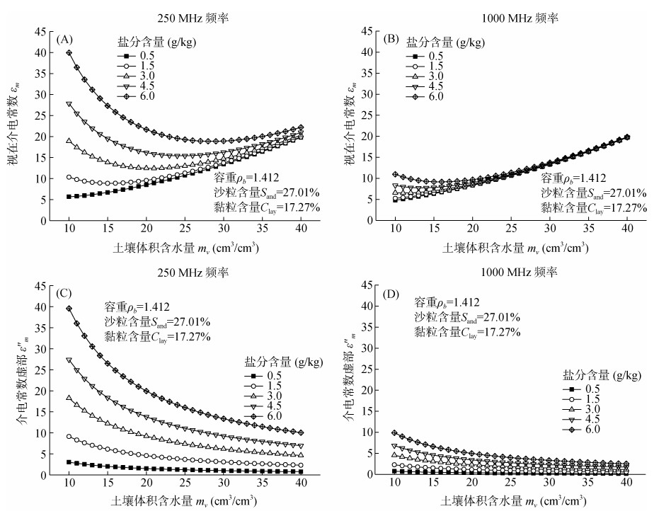 通过图 3B发现,用1 000 MHz频率模拟时,含水率到达一定数值后,盐分含量对视在介电常数的影响程度开始减弱,如:含水率达到25 cm3/cm3之后,5个盐分梯度的视在介电常数随含水量的变化基本一致,含水量的高低开始主导视在介电常数的大小,且两者具有较高的相关性。同时,通过图 3C和3D发现,盐分含量对介电常数虚部的影响较大,盐分含量越高,介电常数虚部越大,并且频率对介电常数虚部具有显著影响,250 MHz频率模拟的介电常数虚部明显大于1 000 MHz频率,其虚部随含水量呈指数形式减小。虽然低频天线穿透能力强,但在盐分含量较高的情况下电磁波传播受阻,能量衰减迅速,介电损耗增加,导致低频虚部大于高频虚部。