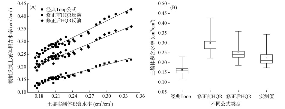 从图 5A可以看出,Toop公式和修正前后的HQR含水量反演公式,均具有较好的线性关系。结合图 5B中的平均值,发现Toop公式计算结果明显偏低,而未修正的HQR含水量反演公式计算结果偏高,只有修正后的HQR含水量反演公式计算结果较好,其拟合方程为y=0.930x+0.041,一阶线性拟合的斜率为0.93。
