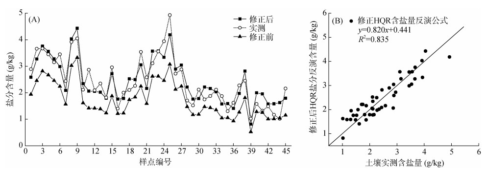 从图 6A可以看出:修正前的盐分含量明显小于实测的盐分含量,而通过修正后的HQR介电模型能较好地反演出各地块表层土的盐分情况,且与实测结果相近,其标准差SD为0.082 g/kg。同时,通过图 6B发现反演结果具有较高的线性相关性,R2=0.835,拟合方程为y=0.820x+0.441,一阶线性拟合的斜率为0.820,RMSE为1.43 g/kg,MRE为15.3%。相比修正前RMSE减小1.75 g/kg,MRE减小13.29%。