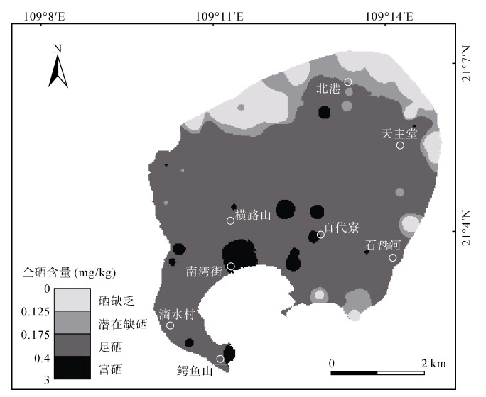 图 2 涠洲岛表层土壤全硒分布特征图 Fig. 2 Distribution of Se content in topsoil of Weizhou Island |
