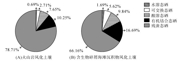 图 3 涠洲岛不同成土母岩风化土壤中各形态硒含量百分比 Fig. 3 Content percentages of various Se forms in weathered soils of different orogenic parent rocks in Weizhou Island |