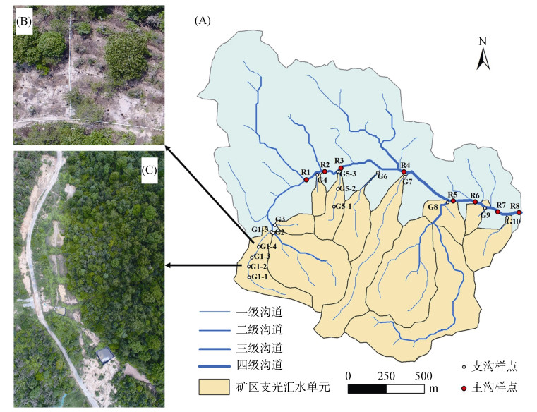 (A:矿区流域范围和采样点分布;B:典型原地浸矿山体浸矿井分布;C:支沟G1沿程崩塌分布) 图 1 矿区概况示意图 Fig. 1 Small watershed of mine area and runoff sampling points |