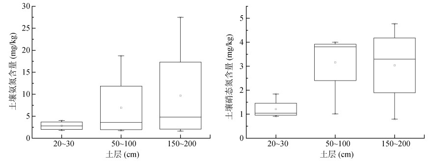 图 2 原状浸矿山体土壤氨氮和硝态氮垂直分布特征 Fig. 2 Vertical distribution of soil ammonia and nitrate nitrogen on undisturbed leaching mountains |