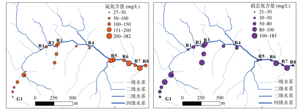 进一步从流域尺度分析沟道径流中氨氮和硝态氮含量的空间分布特征,由图 5可知,不同支沟出口处以及主沟道沿程的径流氨氮和硝态氮含量均存在较大差异。由流域西南部顶端支沟(G1)出发追踪氨氮和硝态氮的迁移趋势,可以看出,支沟G1的氨氮和硝态氮含量均随着迁移路径呈增加趋势,支沟出口处的氨氮含量达到180 mg/L,这是由于支沟G1两侧具有典型的崩塌浸矿山体,高浓度浸矿剂直接出露地表,特别是雨季流域汇流过程强烈的时期影响更为明显。支沟G1氨氮与硝态氮含量高是由于两侧山体浸矿剂的补给,包括坡底的渗流及崩塌坡面的地表径流。在流域汇水过程中支沟两侧山体浸矿剂的输送导致沟道径流中浸矿剂浓度不断累加。