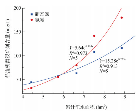 2.3 沟道径流氨氮污染物含量模拟 2.3.1 支沟径流氨氮、硝态氮含量模拟根据前文分析结果,以G1为代表的支沟氨氮及硝态氮含量随迁移距离增加而逐渐增大,这体现了末级支沟两侧山体和坡面对径流残留浸矿剂的补给和汇集作用。假定支沟两侧残留浸矿剂源地的浓度均一,且残留浸矿剂主要通过坡底地表径流汇入沟道,则决定支沟沟道某点氨氮和硝态氮累计量的主要因素是该点所接收的累计地表汇水面积。通过GIS水文分析提取流域累计汇水面积指标,提取G1沿程各点对应的面积信息并建立与残留浸矿剂含量之间的关系(图 6),如图 6的散点图和回归分析结果所示,支沟G1沿程径流氨氮及硝态氮含量随累计汇水面积的递增趋势可以用指数函数进行模拟,氨氮和硝态氮回归方程的决定系数都高于0.9,在P < 0.01水平上显著,说明拟合效果较好。