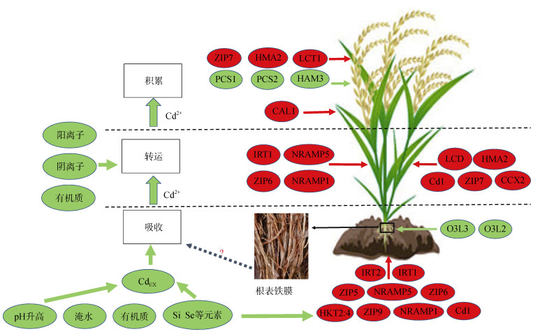 (红色箭头及示意图表示促进Cd的吸收、转运、积累;绿色箭头及示意图表示抑制Cd的吸收、转运、积累) 图 1 水稻Cd吸收、转运、积累机制示意图 Fig. 1 Schematic diagram of absorption, transport and accumulation mechanism of rice Cd |