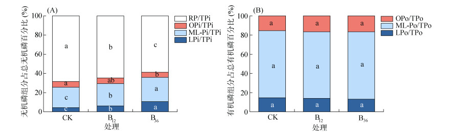 从表 2与图 2A可见,土壤中RP/TPi比例为58.7% ~ 68.3%,表明RP是TPi的主体部分。与CK处理相比,B12和B36处理均显著提高了LPi/TPi和ML-Pi/TPi的比例,但RP/TPi比例显著降低(P < 0.05);而B36处理的OPi/TPi亦有显著降低(P < 0.05)。土壤中ML-Po/TPo比例最大,为69.3% ~ 70.2%,并且生物质炭施用并未显著影响各有机磷组分在TPo中的比例(图 2B)。