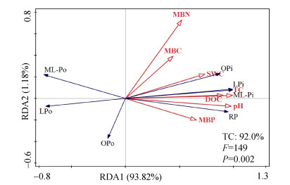 以土壤基本性质(pH、SWC、TC、DOC)和微生物生物量(MBC、MBN、MBP)作为解释变量,土壤磷组分的变化特征值作为响应变量作RDA分析(图 3)。RDA的第1轴和第2轴分别解释变量的93.82% 和1.18%,其中,TC的影响最大,解释了土壤磷组分变化的92.0%,TC与土壤无机磷含量呈显著正相关关系,与土壤有机磷含量呈显著负相关关系。