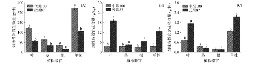 2 结果与分析 2.1 中烟100和云烟87现蕾期的生物量和硫含量由图 1可知,中烟100的叶、茎和根生物量均约为云烟87的2倍(图 1A),但因其各器官硫含量(图 1B) 分别为云烟87的19.89%、78.26% 和43.08%,其单株硫吸收量(图 1C)为云烟87的59.07%。中烟100和云烟87现蕾期的单株硫吸收量分别为1.27 g和2.15 g (图 1C),分别按其种植密度计算可知,至现蕾期,二者每公顷的总硫积累量分别为17.15 kg和32.25 kg,分别约为当地硫肥施用量的11.84% 和25.35%。