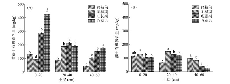 图 3还显示,随生育期延续,黄褐土表层有机硫含量先减少后逐渐增加,团棵期最低,收获后最高,达到最大值时比移栽前增加了296.74 mg/kg,为移栽前的3.28倍;中层有机硫含量先增加后降低,移栽前最低,现蕾期最高,收获后高于移栽前,比移栽前增加了100.38 mg/kg,是移栽前的2.15倍;下层有机硫含量逐渐增加,收获后最高,比移栽前增加了132.12 mg/kg,是移栽前的4.11倍(图 3A)。潮土上层和中层有机硫含量均在团棵期增加,之后逐渐降低,在收获后分别低于和高于移栽前,是移栽前的91.28% 和1.83倍;下层有机硫含量随生育期延续逐渐降低,收获后最低,是移栽前的27.69% (图 3B)。