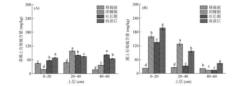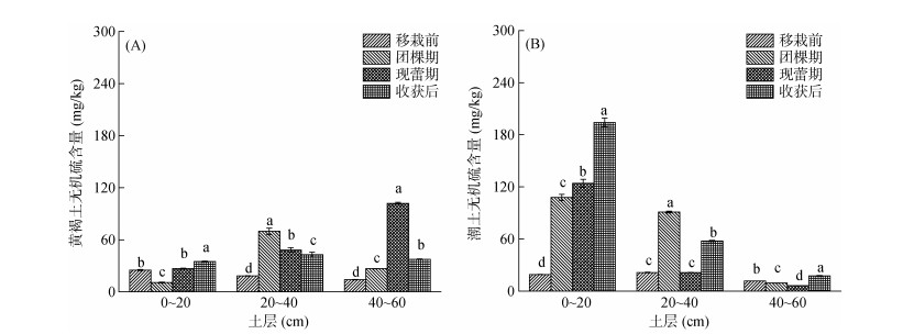 图 4还显示,随着生育期延续,黄褐土表层无机硫含量在团棵期降低,之后逐渐增加,收获后最高,比移栽前增加了9.74 mg/kg,是移栽前的1.39倍;中层和下层无机硫含量均先增加后降低,最大值分别出现在团棵期和现蕾期,收获后高于移栽前,分别比移栽前增加了24.57 mg/kg和23.56 mg/kg,是移栽前的2.34和2.68倍(图 4A)。潮土表层无机硫含量随着生育期延续逐渐增加,收获后最大,比移栽前增加了175.11 mg/kg,是移栽前的10.18倍;中层无机硫含量在团棵期增加,现蕾期降低,收获后再增加,收获后高于移栽前,比移栽前增加了36.25 mg/kg,是移栽前的2.69倍;下层无机硫含量先逐渐降低后增加,现蕾期最低,收获后最大,达到最大值时比移栽前增加了5.85 mg/kg,是移栽前的1.50倍(图 4B)。