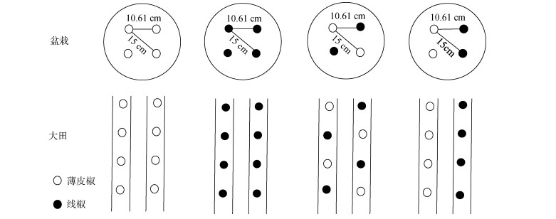 1.2 试验设计试验用塑料盆内径25 cm,高16 cm,每盆装干土6 kg,种植辣椒4棵。辣椒采用同种及不同品种混合种植,共计4种模式(图 1):单独种植薄皮椒(T1)、单独种植线椒(T2)、交叉种植薄皮椒及线椒(T3)(即与一株辣椒临近的两株辣椒为不同品种,较远一株辣椒为同种,在大田中相当于一垄同时交错种植两种辣椒)、同行种植薄皮椒及线椒(T4)(即同种辣椒种植在同一列,另一品种辣椒与其平行,在大田中相当于一垄种植同种辣椒,另一垄种植另一品种辣椒)。试验所施肥料分别为尿素(含N 46.00%,N 160 mg/kg)、过磷酸钙(含P2O5 60.65%,P2O5 80 mg/kg)及硫酸钾(含K2O 53.95%,K2O 130 mg/kg)。肥料施用量均为田间常规施肥量。每个处理3次重复,分3个生育期采样。