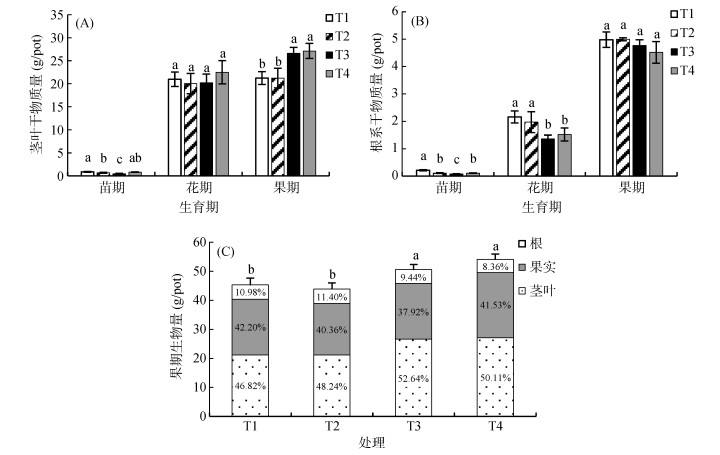 (图中小写字母不同表示同一生育期不同处理之间差异显著(P < 0.05),下同) 图 2 不同生育期辣椒的茎叶干物质量(A)、根系干物质量(B)及果期整株干物质量(C) Fig. 2 Pepper stem and leaf dry weights(A), root dry weights (B) at different growth stages and whole plant dry weight (C) at fruit stage |