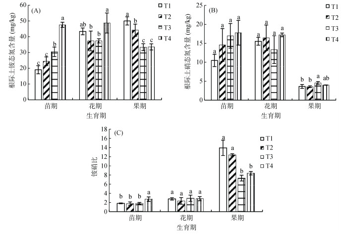 图 5 不同生育期辣椒根际土铵态氮含量(A)、硝态氮含量(B)及铵硝比(C) Fig. 5 Rhizosphere ammonium nitrogen contents(A), nitrate nitrogen contents (B) and ammonium/nitrate ratios(C) at different growth stages of pepper |