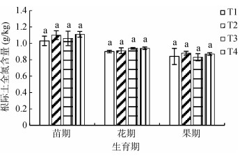 根际土全氮的含量随着辣椒的生长不断降低,苗期时平均为1.08 g/kg,花期时平均为0.92 g/kg,下降14.81%,果期时平均为0.86 g/kg,比花期时下降6.52%(图 6)。其中T1处理花期根际土全氮含量与苗期差异不显著,但果期比苗期显著降低;而T2和T3处理花期比苗期显著降低,但与果期无显著差异;T4处理不同生育期根际土壤全氮含量均显著降低。而在同一生育期各处理之间的全氮含量无显著性差异。