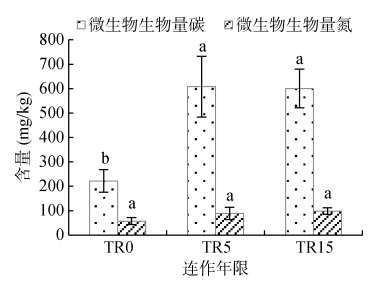 由图 2可知,TR5、TR15土壤微生物生物量碳、氮含量均高于TR0。其中,TR5、TR15土壤的微生物生物量碳含量分别比TR0提高了1.74倍和1.71倍,差异显著(P < 0.05);而TR5、TR15土壤微生物生物量氮分别比TR0提高56.01% 和72.96%,差异不显著。