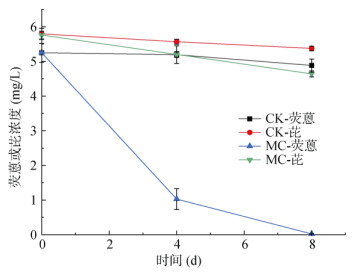 2 结果与讨论 2.1 降解菌降解特性MC菌是荧蒽和芘去除的特效降解菌,近年不少学者利用MC菌研究细菌降低植物体内PAHs的机理,并探究其应用于减少蔬菜中PAHs累积的方法[20-21]。在预试验中,通过液体摇瓶培养试验培养MC菌(28℃暗黑条件下培养8 d;转速为160 r/min;接菌量:取富集后OD600为1.0左右的对数期MC菌1ml于100 ml无机盐培养基中),发现MC菌在8 d内对荧蒽的降解去除(8 d内100% 去除)比对芘的去除(8 d内14.21%)更快(图 1)。