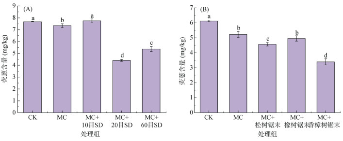 (图B中供试土壤为黄棕壤,培养15 d),MC代表Mycobacterium flavescens降解菌,SD代表木屑,百分比代表添加比例;柱图上方不同小写字母表示荧蒽(芘)在不同处理之间差异达P < 0.05显著水平;下同) 图 2 荧蒽在老化土壤中的变化(A)及锯末添加比例对荧蒽和芘降解效果的影响(B) Fig. 2 The changes of fluoranthene concentrations in soils(A)and the effects of sawdust addition ratio on the degradation of fluoranthene and pyrene(B) |