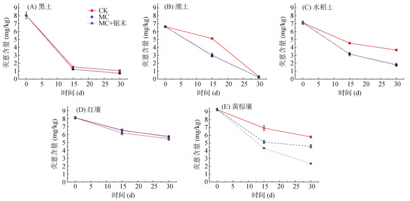 2.4 土壤类型对锯末原位强化修复效果的影响荧蒽污染的土壤(黄棕壤、黑土、潮土、水稻土和红壤)在空白对照处理中显示不同的原位去除荧蒽的效果(图 2A)。图 2B和图 3的试验结果显示,锯末的添加可以强化MC菌降解去除黄棕壤中的荧蒽污染。对于其他4种土壤,试验结果(图 4)显示,黑土中,空白对照处理、只添加MC处理与添加MC+锯末处理土壤中荧蒽去除的趋势大体一致,15 d时去除率为82.28% ± 1.14%,30 d时去除率为89.28% ± 0.77%,其中,15 d时与空白对照处理相比,MC处理和MC+锯末处理均能显著降低荧蒽浓度,但两处理间并无差异;30 d时与空白对照处理相比,MC和MC+锯末处理组均能显著降低荧蒽浓度,且MC+锯末处理较单一降解菌MC处理有显著(12.5%)促进作用,说明在黑土中加入锯末强化去除荧蒽有显著作用。在空白对照处理中未加入MC菌和锯末,15 d后也可以很快去除荧蒽,可能的原因是黑土中存在可以降解污染物荧蒽的微生物群落,并且黑土中有机质含量(54.71 g/kg)很高,微生物群落生长较快,因此对污染物荧蒽的去除也快。HUANG等[22]的研究发现,黑土在培养21 d后可将5、30和70 mg/kg的芘降解完全,且芘的减少与土壤中芘双加氧酶基因(nidA)丰度的增加呈正相关关系。