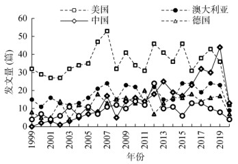 利用Web of Science数据库分析各国“土壤种子库”研究成果的影响力,结果显示,论文总量排名前10位的国家为美国、澳大利亚、中国、德国、西班牙、巴西、英国、法国、加拿大和阿根廷。其中前6个国家的发文量在200篇以上,而美国的发文量为783篇,占前10位国家总发文量的30.71%,与排名第二的澳大利亚相差393篇,另外中国的相关研究论文为316篇,占前10位国家总发文量的11.19%,总体研究有待深入。从年发文量上看,1999—2018年共20年时间中,美国的发文量一直处于领先地位,2019年中国发文量首次超越美国(图 2)。
