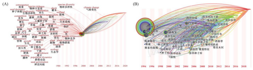 图 6 Web of Science(A)和CNKI(B)数据库土壤种子库研究前沿时区视图 Fig. 6 Zone views of soil seed bank research frontier in Web of Science(A) and CNKI(B) |