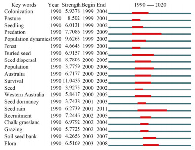 通过对Web of Science的检索结果进行突变词分析发现,突变词“predation(捕食)”和“seed rain(种子雨)”的持续时间最长,均持续了11年时间(图 7)。结合前沿时区视图可得出,有关土壤种子库的研究主要集中在种子库中种子持久性及种子的散布相关研究上。