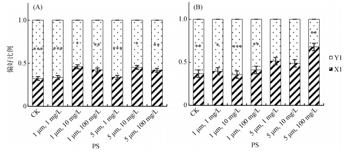 (A. 不同粒径和浓度的PS微塑料短期暴露;B. 不同粒径和浓度的PS微塑料长期暴露;图中误差线表示标准误,*、**、***分别表示每组内X1与Y1菌区线虫数量的差异达P < 0.05、P < 0.01和P < 0.001显著水平) 图 3 不同粒径和浓度的PS微塑料暴露后线虫对X1、Y1的取食偏好 Fig. 3 Feeding preferences of C. elegans after exposure to polystyrene particles with different-sizes and concentrations |