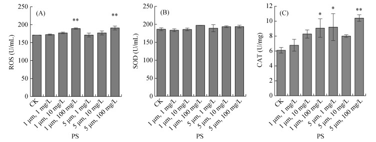 对在不同粒径和浓度的PS微塑料中暴露15 d的秀丽隐杆线虫体内的过氧化氢酶(CAT)活性进行测定,结果显示,当PS微塑料粒径为1 μm时,各浓度暴露组的线虫体内CAT的含量随着PS微塑料浓度的升高而升高,1 mg/L和10 mg/L的PS微塑料暴露组与对照组相比无显著差异(图 4C);但100 mg/L的PS微塑料暴露组则与对照差异显著(P < 0.05),与对照组相比,线虫体内CAT含量升高了0.4889%。当PS微塑料粒径为5 μm时,低暴露浓度(1 mg/L)和高浓度暴露组(100 mg/L)线虫体内的CAT含量与对照组相比均有显著差异,分别比对照组升高了51.12% (P < 0.05)和70.92% (P < 0.01)。