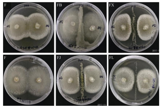 (F:禾谷镰刀菌CGMCC3.4598;FB、FX、FJ和FL分别表示禾谷镰刀菌CGMCC3.4598与蜡状芽胞杆菌ACCC10263、吸水链霉菌ACCC41648、吸水链霉菌井冈变种ACCC40051和娄彻氏链霉菌ACCC41594的平板对峙) 图 1 4种拮抗菌株对禾谷镰刀菌CGMCC3.4598的抑制作用 Fig. 1 Antifungal activities of four antagonistic strains against F. graminearum CGMCC3.4598 |