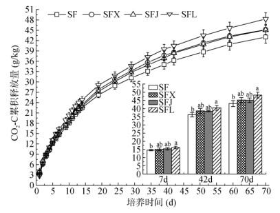 2.3 拮抗链霉菌对秸秆矿化特征的影响不同处理玉米秸秆CO2-C累积释放量的变化规律相同,均呈前期(0 ~ 14 d) 增速较快,随着培养时间延长而增幅减缓并逐渐走向平稳的趋势(图 3)。秸秆降解的前14 d,各处理秸秆CO2-C累积释放量在22.54 ~ 24.77 g/kg,占培养结束时(70 d) 秸秆CO2-C累积释放量的50.98% ~ 52.38%,表明玉米秸秆在培养初期的矿化过程剧烈。对比不同处理来看,秸秆降解7、42和70 d后,SFL处理的秸秆CO2-C累积释放量均达到最大,分别较不添加任何拮抗链霉菌的对照(SF)显著提高11.07%、11.58% 和12.12% (P < 0.05),而SFX和SFJ处理的CO2-C累积释放量与SF处理相比均无显著差异,该结果表明娄彻氏链霉菌ACCC 41594的添加对玉米秸秆的降解有显著促进作用。