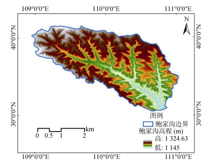 1 材料与方法 1.1 研究区概况研究区位于内蒙古鄂尔多斯市准格尔旗鲍家沟流域(图 1),地理坐标为110°31′ ~ 110°35′E、39°46′ ~ 39°48′N,海拔在1 110 ~ 1 300 m;属温带大陆性气候,冬季漫长干燥,夏季短暂温热,年降雨量400 mm,多为暴雨。研究区降雨量集中在夏季(6—8月),夏季多年平均降水量256.4 mm,占全年降水量的64.1%。光照资源丰富,年日照时数3 100 ~ 3 200 h,年日照率大于70%,多年平均气温7.2 ℃,无霜期平均135天。土壤基岩为砒砂岩(表 1),以栗钙土为主,土层厚度小于1 m。腐殖质层厚度一般为20 ~ 30 cm,有机质含量较低,pH 8 ~ 8.5,质地一般为沙壤土,结构为小粒状。植被属于温带干旱草原植被,植物类型多以多年生的草本植物组成,以禾本科植物为主,其次是菊科、豆科植物,另有部分小灌木、半灌木,以豆科、菊科为主。主要人工植被有沙棘(Hippophae rhamnoides)、柠条(Caragana Korshinskii)、油松(Pimus tabulaeformis)等。