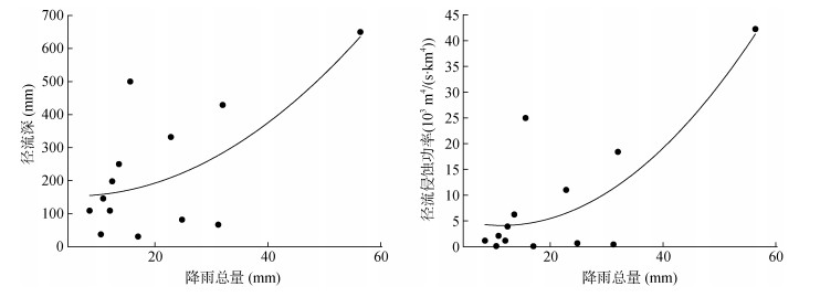 此外,通过降雨总量与径流深和径流侵蚀功率的关系可以得出,降雨总量和径流深和径流侵蚀功率呈显著的正相关关系(图 4),其关系可以分别拟合成多项式的函数形式。径流深和降雨总量符合的多项式函数为:y = 0.186 2x2–2.055 2x + 159.26,R2为0.46;径流侵蚀功率和降雨总量符合的多项式函数为:y = 0.018 4x2–0.419x + 6.521 8,R2为0.64。说明降雨量对坡面产流具有明显促进作用,这一结论与李霞等[20]的研究一致。